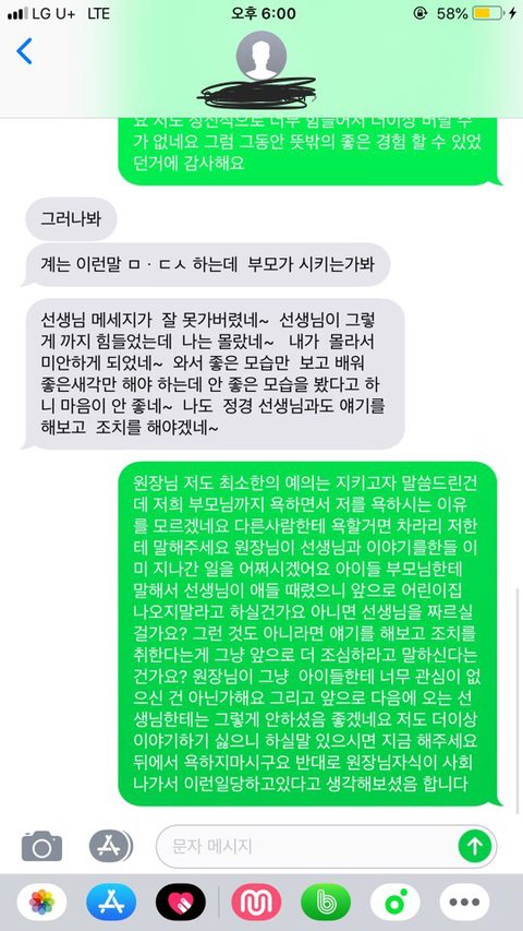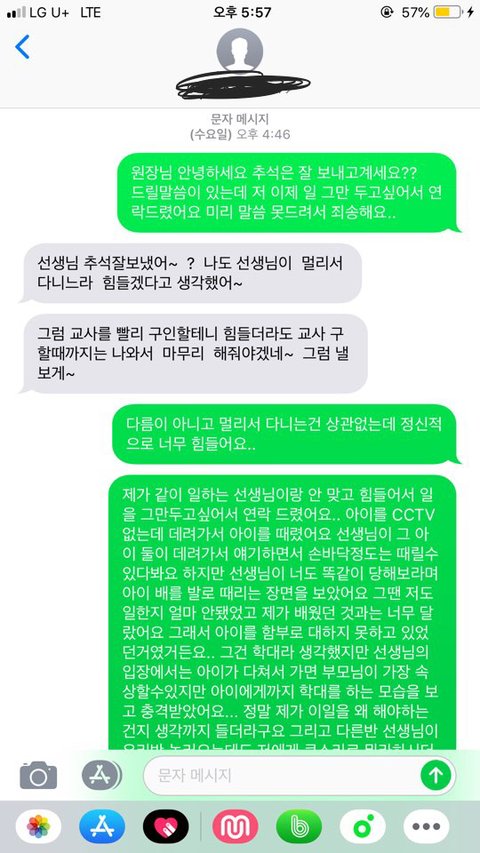 제가 그 선생님이 CCTV없는 곳 데려가 아이를 배를 찼다 연락드려 일을 그만두겠다 문자를 드렸습니다.