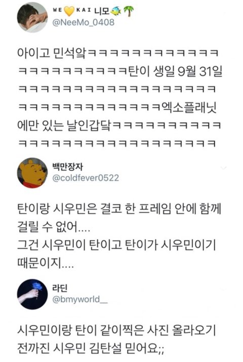 이번에야 말로 투샷 안뜨면 탄이는 시우민이 밤마다 변신한 혼현이라는설 기정사실화 되는거임