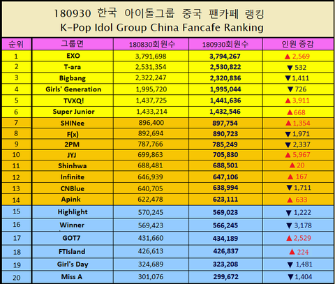 180930 한국 아이돌그룹 중국 팬카페 랭킹
