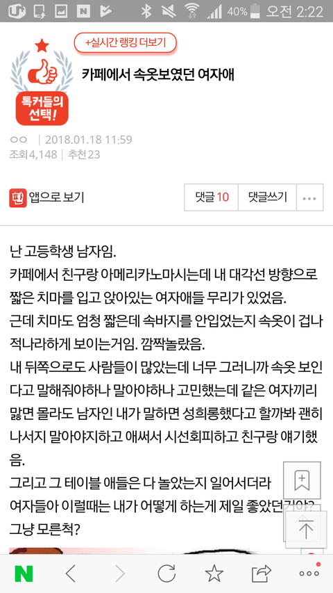 예전 판글인데 만약 너네들이 밖에서 너네 자신도 모르게 속옷이 보이고 있었다면 그걸 모르는 남자가 속옷보인다고 알려주는게 나아? 아니면 사람들한테 계속 속옷이 보이든말든 아무도 말안해주는게 나아?