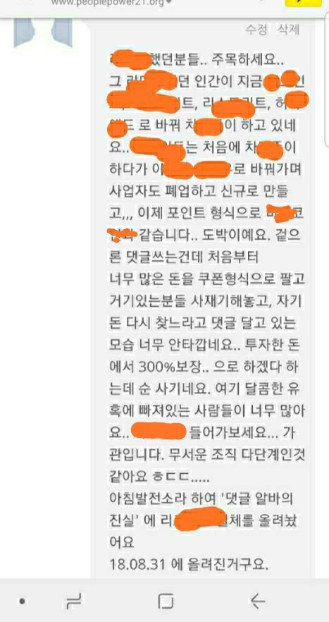 아니 처음 가입 할 때와는 전혀 다른 조건으로 지금 전 회원을 기만하고 우롱하고 있습니다 처음 가입시 쿠폰 구매후 하루 댓글 20개 완료 후 쿠폰 금액에 따라 매일 해당 쿠폰의 적립금을 적립 후 송금신청 해 주셨는데, 갑자기 지난 달 2018.09.17 공지를 띄우고 시스템 업그레이로 2018.10.01시스템 재계를 한다고, 그러더니....... 처음 계약과 다르게..... 어제 2018.09.30 듣도 보지도 못한 계약위반에 의한 전 회원 ㄹ#인트, 허#포인트 로그인 불가조치, 판정을 내리고 오늘 2018.10.01 새로운 사이트 ㅍ인트#은 아직 가입 하지도 못하게 일도 못하게 해 놓고 말입니다....... 이제와서는 계약위반으로 활동정지 상태 회원은 가입불가 내용증명 도착 후 본사에 방문요청, 방문 후 본사의 조치 후 활동재개 이런식으로 나오는군요...... 그런데 내용증명은 2018.10.04 부터 순차적으로 발송 한다고 하구요...... 이게 말이 되나요? 지금 저희 전 회원은 일도 못하고 지난 달 일한돈도 받지도 못하고 있습니다...... 좋은 의견 부탁드려요