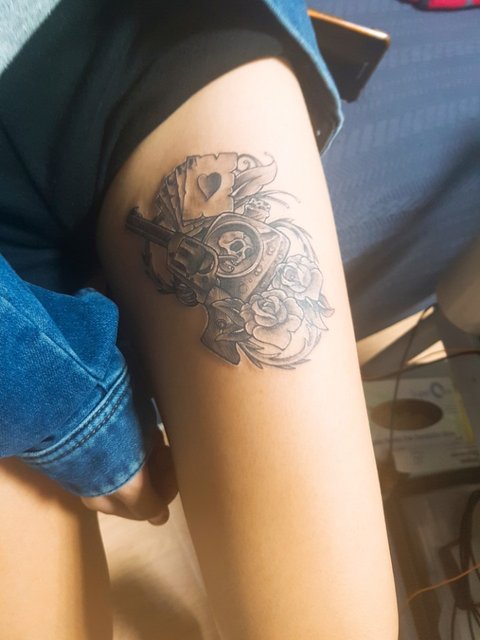 치카노 올드스쿨 짬뽕인데 할거면 칼라로 하지 나중에 색 다 올라오면 이런 디자인은 별로안이쁨 허벅지 부위에 도안 위치도 별로고 종사자임...