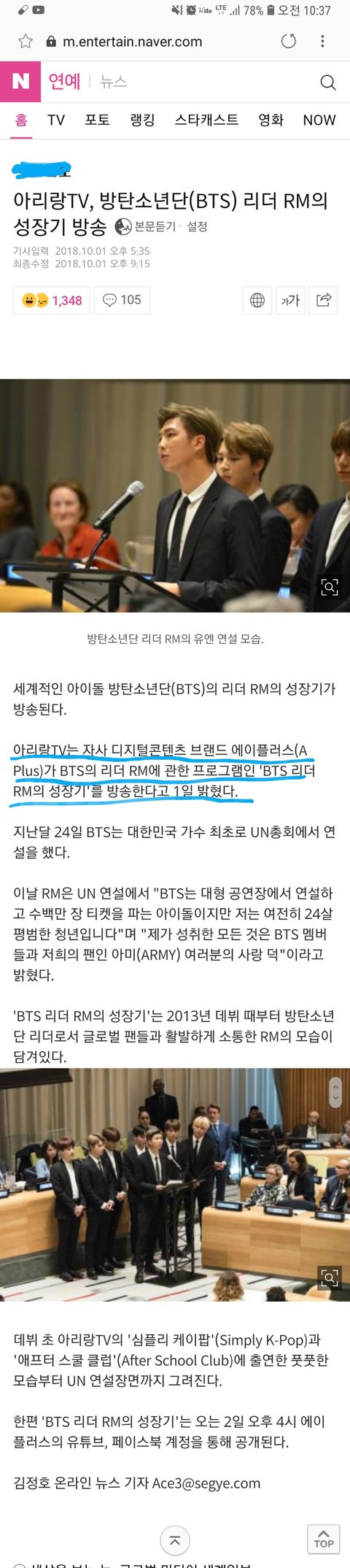 오늘 오후 4시 남준이 성장기 아뤼랑 티비 에이플러스에서 방영된대