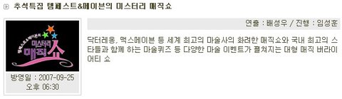 출연 : 김구라, 김현철, 브라이언, 붐, 신동, 솔비, 사오리, 나경은, 오상진 아나운서 / 일반인 도전자 mr. 쎄로의 슈퍼매직쇼 '내 눈을 믿을 수 없다' * 방송 : 2007년 9/26(수) 18:05-19:45 2006년 추석! 공중부양 마술, 생수 통에 든 물을 순식간에 얼음으로 바꾸는 마술 등 놀라운 마술을 선보여, 시청자들의 사랑을 한 몸에 받았던 마술사 쎄로! 일상에서 흔히 볼 수 있는 사물로 놀라운 마술을 선보이는 일명 <스트리트 매직 쇼>의 달인인 그가 2007년 추석을 맞아 다시 한 번 한국을 방문해 재미와 감동을 전달한다. 올해는 쎄로가 직접 한국 사람들이 많이 모이는 찜질방, 번화가 등을 방문해 각종 신기한 마술을 보여줄 예정이다. 진행 : 박경림, 서현진 아나운서