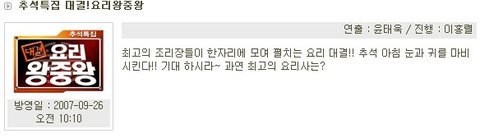 축하공연 : 거미&린, 클래지콰이 최강! 외국인 며느리 열전 * 방송 : 2007년 9/25(화) 09:30-11:45 우리나라 인구 중 10%가 국제결혼을 선택하는 시대! 대한민국에서 외국인 며느리로 살아가는 이들의 솔직 담백한 에피소드와 개인기가 펼쳐진다. 그리고 편견과 오해 속에서도 아내이자 며느리, 어머니의 자리를 지켜가려는 억새풀 같은 그녀들의 목소리를 들어본다.