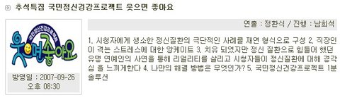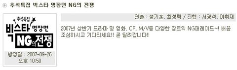 * 방송 : 2007년 9월 23 (일) 08:20-09:30 민족의 대명절 추석을 맞아 온 가족과 함께 웃음 엔돌핀을 충전하는 시간! 스타들의 초특급 ng 총 출동!! 2007년 방송된 mbc 모든 프로그램의 ng부터 추억의 프로그램 속 ng까지 총 망라!! 커플들의 ng를 모아 커플 ng왕을 선발하고 캐릭터별 ng 유형비교, 최고의 ng왕등 다양한 구성을 통해 보다 재미있게 ng를 감상해본다. 진행 : 박수홍, 최은경 mbc 추석특집 「공부의 신(神)」 * 방송 : 2007년 9월 23일(일) 22:50 ~ 24:15