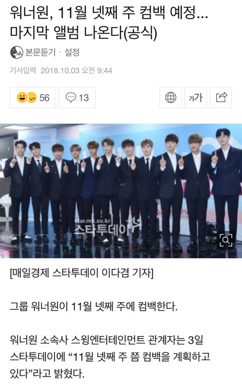 드디어 컴백!!!!!!!!!!!!!!!! 아근데 넘 늦다.......예상 10월말에서 11월초일줄 알았는데 ㅠㅜㅜㅜㅠ아까 다른 기사에선 19일 이라고 딱 찝어말하던데 정확한건진 모르겠구 하 그냥 빨리 나오기만 해라 ㅠㅠㅠㅠㅠㅠㅠㅠ
