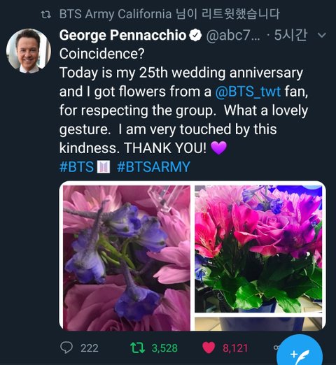 이 분도 우연의 일치인지 결혼 25주년일에 아미들이 꽃을 보내왔다고 고맙다고 트윗하셨네 ㅎㅎ 우리 외랑둥이들 참 마음들이 이뿌당 열일해 HANGSANG