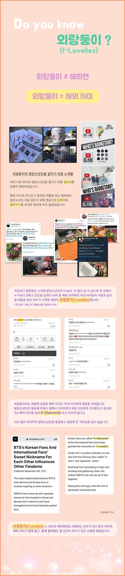 먼저 외랑둥이는 단순한 해외 팬을 나타내는 단어가 아니라 방탄소년단 홍보를 위해서 열심히 노력한 외국 아미들에게 우리가 만들어준 애칭임을 알아야 함 외랑둥이라는 단어를 만든 곳은 방탄소년단 갤이고 2016년 10월에 만들어졌음 (밑 사진, 움짤 참고)
