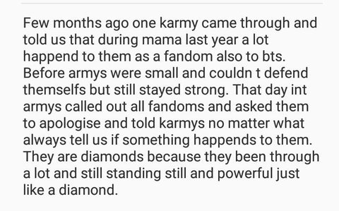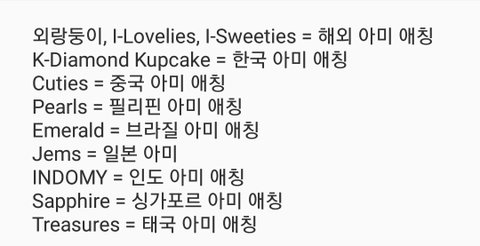 그 애칭이 만들어진 것에 감동을 받고 외랑둥이 즉 I-Lovelies들이 우리에게 K-Diamond라는 애칭을 지어줌 이 외에도 Kupcake K-Lovelies 등 여러 애칭을 만들어서 쓰는 것도 보았음 케이 다이아몬드 뜻은 한국 아미들은 안티들에게 후드려 맞음에도 불구하고 맞으면 맞을 수록 더욱 더 단단해져서 방탄소년단을 보호한다는 의미 ㅇㅇ