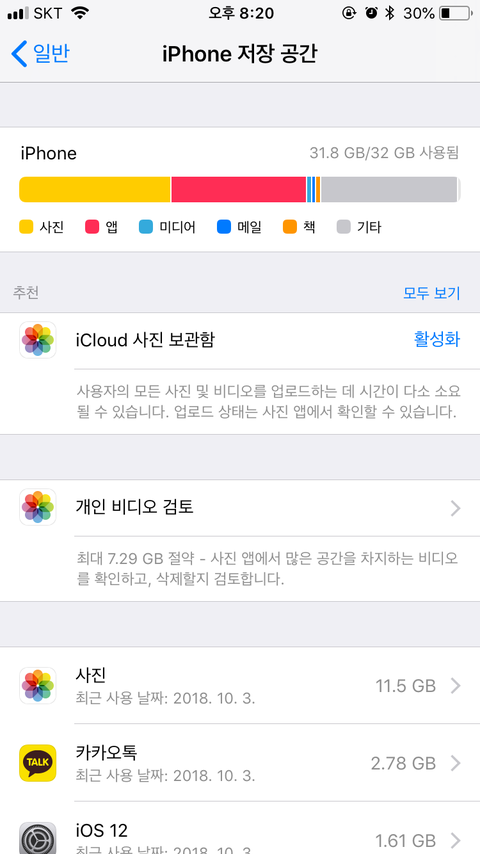 전에 사진 한 오천? 육천장 있어서 다 하드디스크로 옮겻는데 지금 다시 한 천장정도 쌓엿거든... 근데 천 장 있다고 그렇게 막 저장공간 관리 하라고 안 햇엇는데 앱도 뭐 별로 안깔앗고... 저 기타는 무슨 뭐길래 저렇게 차지하는거야?????? 저장공간때매 스트레스받아;; 카. 톡 들어갈때도 ㅈㄴ 계속 정리하라고 뜨고 뭐 순간 사진찍으려고 하면 저장공간 부족해서 못 찍어 ㅠㅠㅠㅠㅠㅠㅠ 알려줘 그리고 혹시 뭔가 팁.. 팁이 잇긴한가 저장공간 관리에..? 그래도 뭐 아이폰 잘 아는사람 댓글로 알려줭
