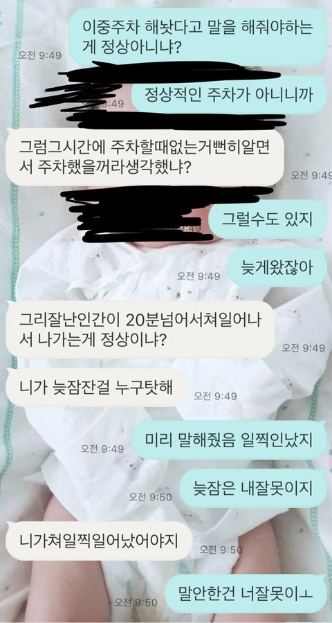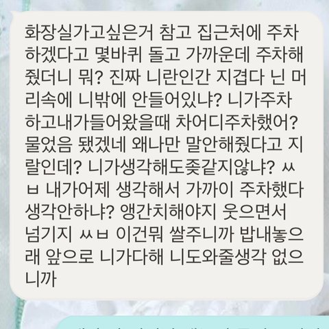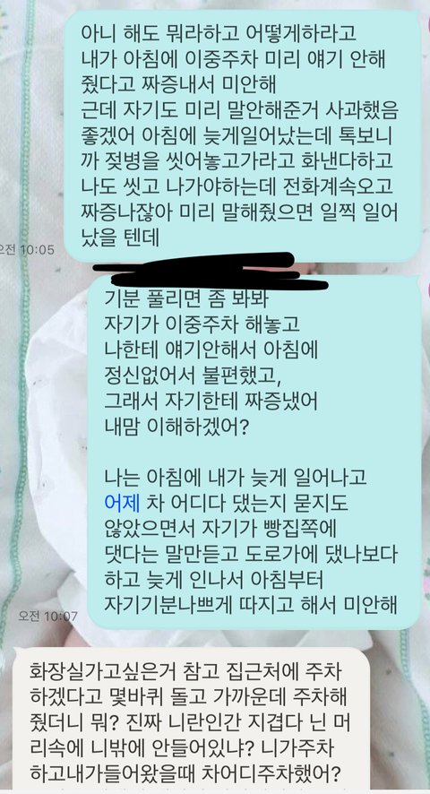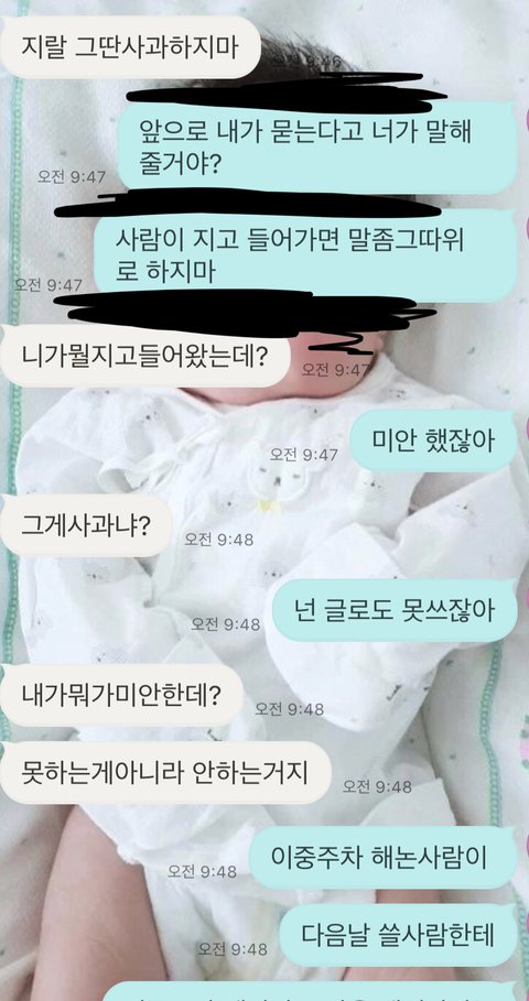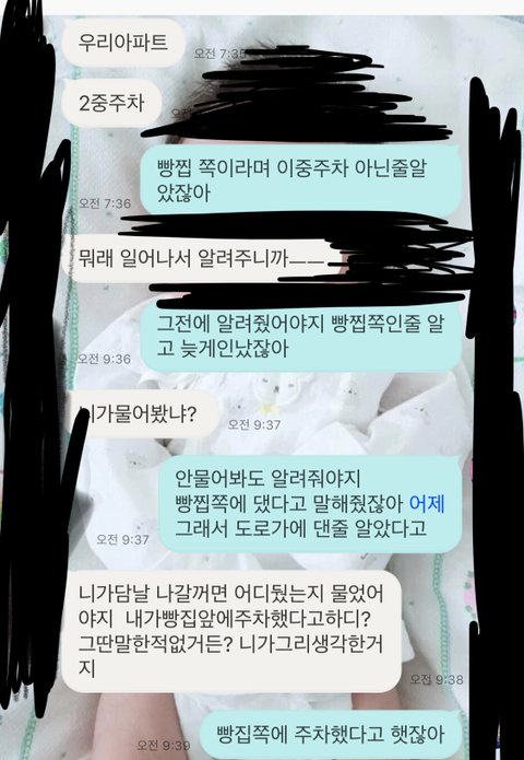아침에 주차문제로 싸웠습니다. 흰색이 잘못한것인지 녹색이 예민하게 반응하는건지 주차문제하나로 싸움이 이렇게 커지네요 잘잘못좀 가려주세요 뭐가 잘못된건지 댓글좀 달아줘요