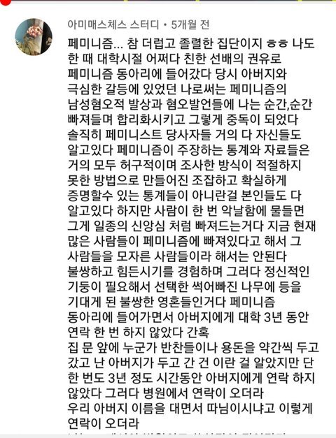 본문 여자가 ㅂㅅ인거고, 실제 남자한테 차별받아서 페미된 사람들까지 싸잡아서 정신병이라 욕하기 너무 뻔하다^^