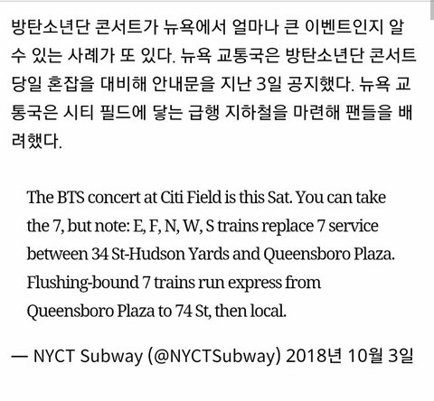 뉴욕지하철 방탄때문에 콘서트날 지하철 급행 추가편성...