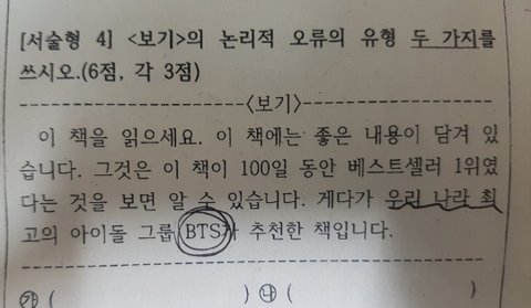 시험 서술형에서 방탄나옴ㅋㅋㅋㅋㅋ