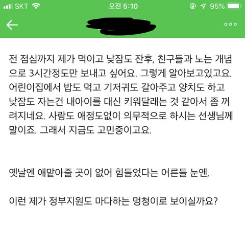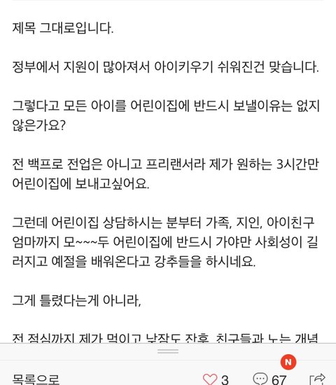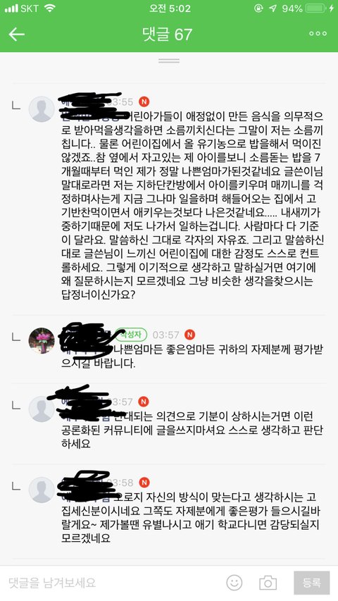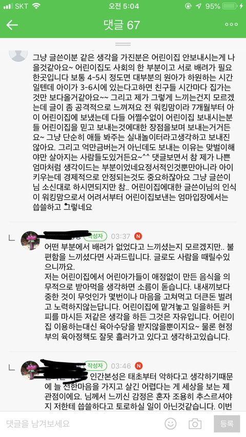 원글쓰니...집마다 사정이 다른데...소름이 돋는다니 어쩌니하면서 나쁜엄마로 만들며 나는 좋은엄마라서 그런거 싫다 이러는데 댓글러가 기분 안나쁘겠나. 지 생각이 그렇게 확고하면 조용히 키즈카페같은 어린이집 찾아서 보낼것이지