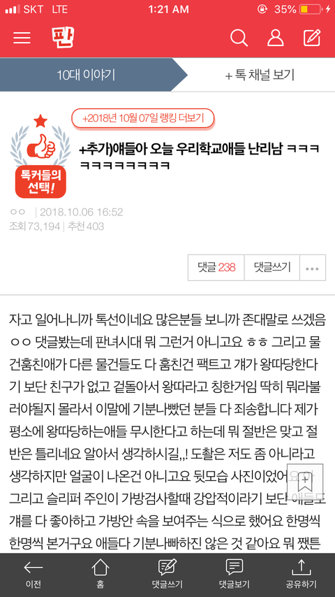 자고 일어나니까 톡선이네요 많은분들 보니까 존대말로 쓰겠음ㅇㅇ 댓글봤는데 판녀시대 뭐 그런거 아니고요 ㅎㅎ 그리고 물건훔친애가 다른 물건들도 다 훔친건 팩트고 걔가 왕따당한다기 보단 친구가 없고 겉돌아서 왕따라고 칭한거임 딱히 뭐라불러야될지 몰라서 이말에 기분나빴던 분들 다 죄송합니다 제가 평소에 왕따당하는애들 무시한다고 하는데 뭐 절반은 맞고 절반은 틀리네요 알아서 생각하시길,,! 도촬은 저도 좀 아니라고 생각하지만 얼굴이 나온건 아니고요 뒷모습 사진이었어요 아 그리고 슬리퍼 주인이 가방검사할때 강압적이라기 보단 애들도 걔를 다 좋아하고 가방안 속을 보여주는 식으로 했어요 한명씩한명씩 본거구요 애들다 기분나빠하진 않은 것 같아요 뭐 쨌튼 오늘은 좀 잠잠한데 내일 상황보고 후기 남길게요 감사합니당