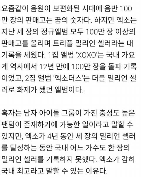 엑소가 감히 국내 최고라고 말할 수 있는 이유다.