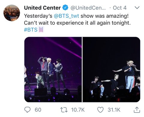 사진은 평소 Rt나 하트 수 1k 가 잘 안나오는 United Center 공식 트위터가 BTS 사진 올렸다고 K따위 그냥 넘겨버린게 귀엽고 웃긴거 같아서 ㅋㅋㅋ