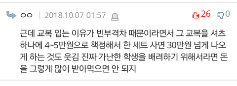 ++이 댓글이 딱 내가 하고 싶은 말이다 ㅋㅋㅋㅋ 댓글 단 애들아 너네 진짜 바보야? 교복하고 사복을 떠나서 옷 원가가 일반 옷만큼 낮은데 학생들이 산다는 이유로 20만원 넘게 받아먹는거를 욕하는거잖아 모든 학교를 다니는 학생들이 입는다는거를 이용해서 부르는게 값대로 비싸게 받는게 화가 나는거라고 너네가 평소 사는 만원짜리 티랑 교복이 재질이 다르지가 않는데 몇만원하는게 아까운거라고 사복 입자 교복 폐지하자는게 아니고 도매가로 판매하는거면 싸야 하는데 비싸다고 답답해 뒤지겠네 니네 왤케 멍청하냐 당연히 옷 한벌 입는게 사계절 옷 뭐 입을지 고민하는거 보다 싸지 말 뜻을 어떻게 그렇게들 이해하니 댓글 보고 뒤질뻔했다