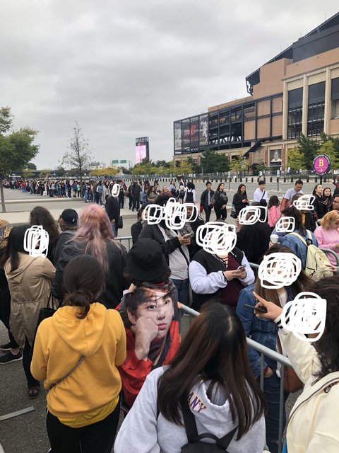 콘서트 시작 전 상황은 한국 뉴스에도 나왔겠지만 금요일 낮 (콘서트는 토요일 밤7시)에 스탠딩석 줄은 선착순이라 이미 1100명 넘어서 엄청 긴장했어요. 저희 줄은 좌석이라서 스탠딩이랑 크게 관련은 없었는데, 굿즈? 라고 하나요 방탄소년단관련 물품 (merchandise) 같은거 사려고 했는데 아 스탠딩이 저 정도면 물품은 어떨까해서 원래 토요일 한 2-3시쯤 천천히 가려던걸 새벽 다섯시에 가는 걸로 계획을 변경했습니다ㅋㅋ (아침에 일찍 일어나기 싫었는데 사촌이 너무 행복해하는 모습을 보고 안 그럴수가 없었어요ㅠㅠ) 나름 일찍가는거라 생각하고 가서 텐트 광경 구경해야지 했는데, 도착하고 보니 스탠딩석은 이미 텐트 접고 다 줄 서있고 굿즈 줄고 주차장 A구역였던거 같은데 반바퀴를 넘었었어요ㅋㅋㅋㅋ 그 때가 새벽 6시 안됐나 그랬던거같은데 굿즈 사려고 주차장 한쪽 면? 그 줄은 다 텐트치고 낚시용의자 갖고 와서 담요덮고 자고 있고 그러더라구요ㅋㅋㅋ 아 참고로 굿즈 부스는 9시부터 오픈이였어요!