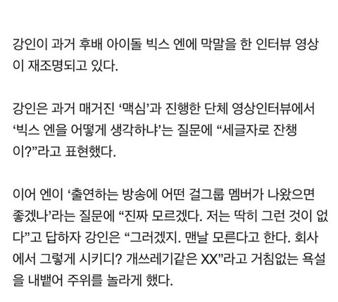 나 구 별빛 현 엔시티즌인데 쟨 왜 자꾸 내가 좋아하는 아이돌들한테만 저러냐 ㅋㅋㅋㅋㅋㅋ 저 사건 있었을 때 별빛이었는데 진짜 짜증났음ㅋㅋㅠㅠ 팬덤이 막 그렇게 크진 않아서 묻히긴 했는디... 강인도 진짜 짜증났고 ㅠㅜ 제발 정신차려 ㅜㅜ 너네 이런 말 듣는 거 엔시티, 빅스, 모모랜드 연우 때문 아니고 너네 때문이고 너네가 자초한 일이니까 이번 기회엔 제발 정신차리자 제발...ㅜㅜ