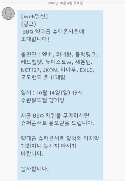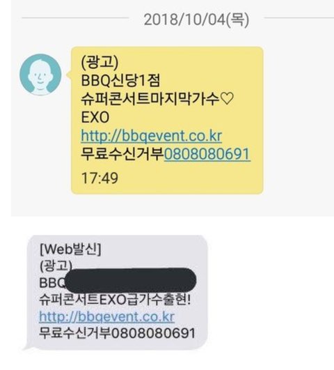 엑소팬들이 받은 BBQ 슈퍼콘에 엑소가 나온다는 홍보문자들