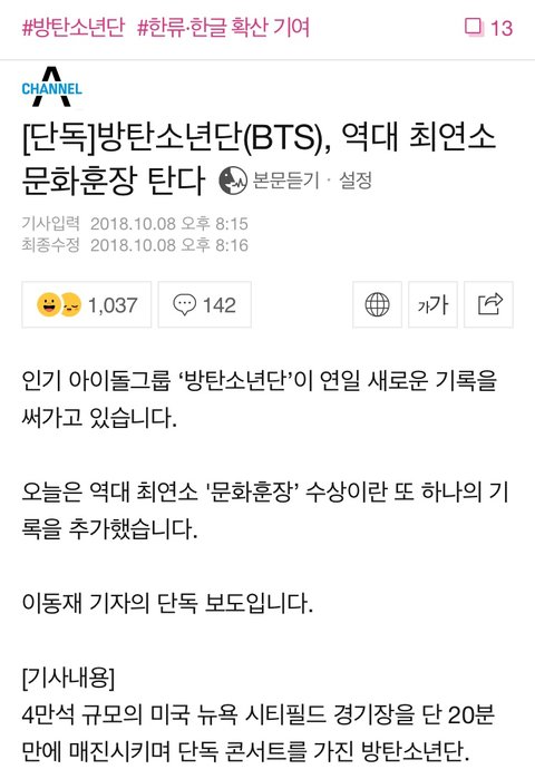 대박 이거 지난번에 후보된 것만으로도 기쁘다고 네입어 댓글에 주욱 달려서 못 받겠구나 했던 그 상이자나 방탄이 최연소 후보자랬는데 맞나? 미친다 진짜