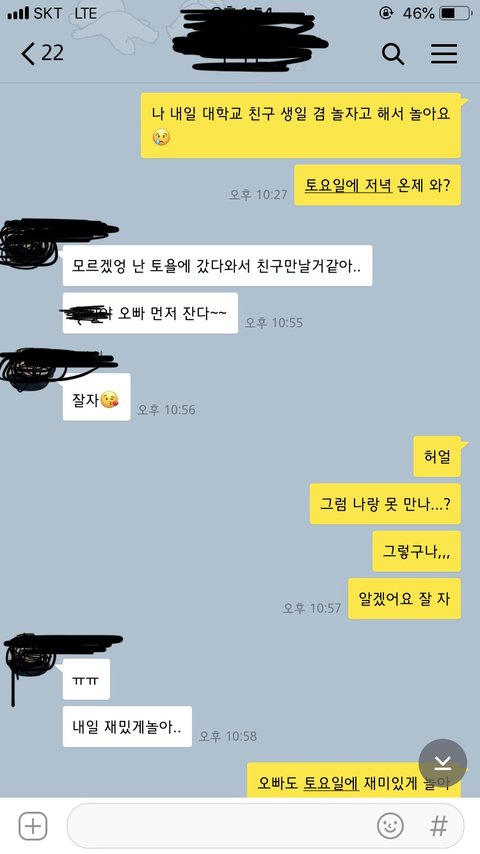 그사람한테 뻔뻔하게 언제 볼거냐고 보고싶다고 그러고는 나한테도 보고싶다고 그러고 사랑한다고 그랬던 니가 이제 정말 무섭다. 그사람도 너랑 나랑 연애하는거 안다고 그러니까 진짜 사람이 무섭다. 알면서도 그럴 수 있는지... 이것 말고도 바쁘다고 연락안됐는데 그 사람이랑은 연락했던거 등 많지만 여기까지 할게 그러면 안됐어.