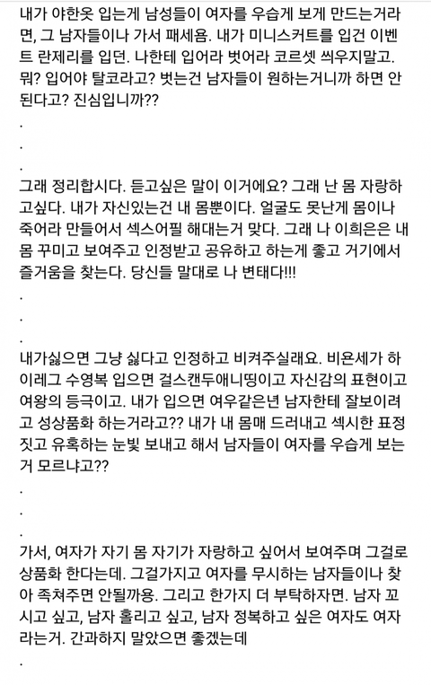 난 페미니즘 지지하는데도 저 말 틀린 거 없다고 보는데ㅋㅋㅋㅋㅋ 패미니즘음 여성이 누구의 눈치도 보지 않고 원하는 것을 하게 만드는 것이라고 봄 수영복을 입든 말든 화장을 하든 말든 누구도 신경 안쓰는거. 화장을 안하고 안꾸미는 것만 페미니즘이 아님ㅋㅋㅋㅋㅋ