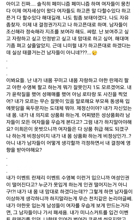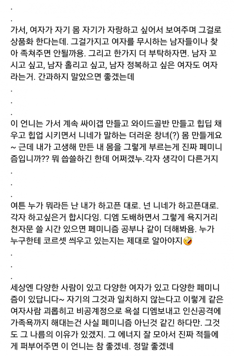 난 저 사람 몸매 자랑하는거 아무생각 없지만 로타랑 같이 서진찍고 작업한건 쉴드불가다 게다가 한남들한테 우쭈쭈 받는건 굳이 페미 아니더라도 현타올거 같은데