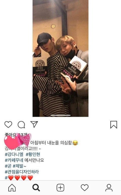 어제 타사이트에서 민 현이랑 다니엘 봤다는 댓글 있었어 ㅋㅋㅋ 민 현 이 공항에서 입은 적 있는 줄무늬 옷 입고 있었고 다니엘은 옷핀 귀걸이 하고 있었다고.. 둘다 마스크도 안해서 알아본거 같던데 택시타려고 잡으러 가는거 우연히 보고 다리에 힘풀렸다는 내용 정도만 올라왔었어 ㅋㅋㅋㅋㅋㅋ