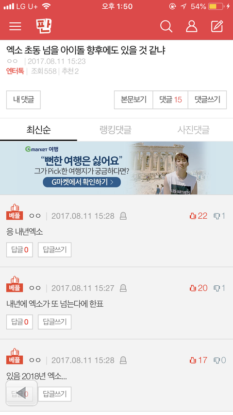 저게 뭐 남 깐 것도 아니고 ㅋㅋㅋㅋㅋ 저 당시에 초동 50만 넘는 거 엑소 하나였음 그리고 항상 팬들도 그렇고 애들도 그렇고 라이벌을 작년의 엑소라고 생각했음 그러니 2017년 엑소를 넘는 건 2018년 엑소라 한 게 뭐가 잘못된 건 아니잖아
