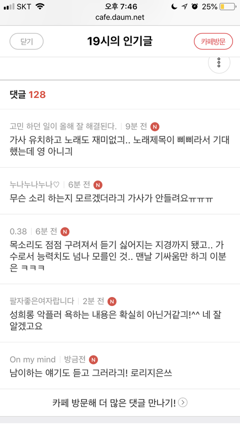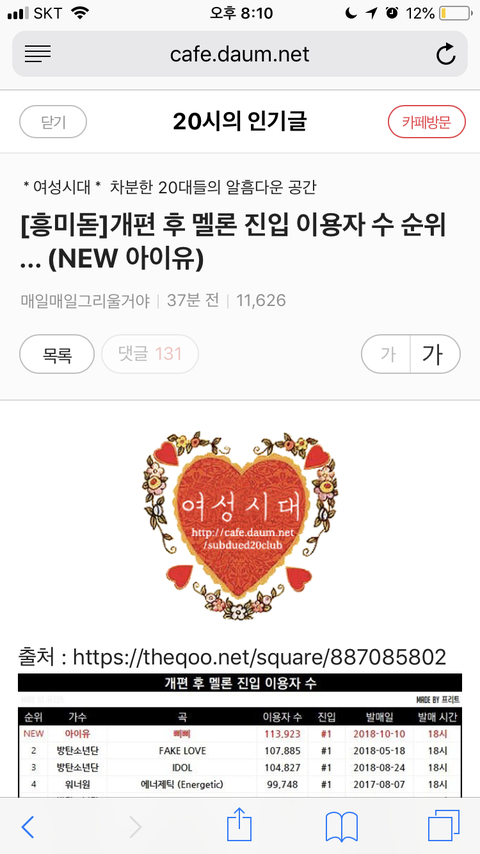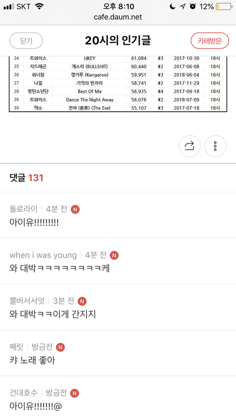 그래서 오죽하면 가사 보자마자 너무 통쾌해서 (아이유 ㅠ)저 카페 반응 궁금하니까 혹시나 해서 인기글로 가봄ㅋㅋㅋㅋ