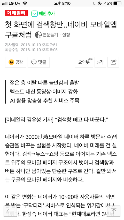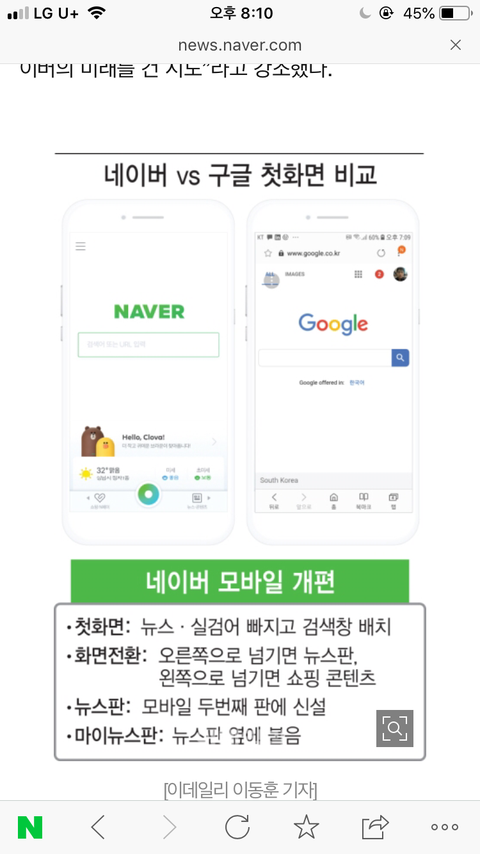 네이버 첫화면이 구글 검색창 화면처럼 바뀐데