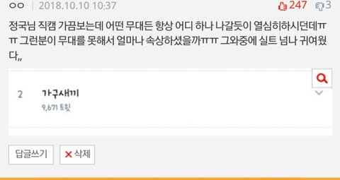 엔터에 저 댓글로 베플먹은 사람입니당 넘나 tmi져? 댓글에도 있듯이 직캠보다가 입덕할것같아요.. 방탄님들 레전드 짤 부탁드려요ㅠㅠ