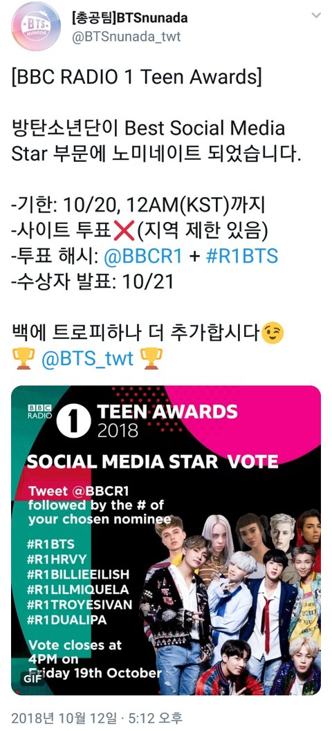 새로운 툽! BB씨 라됴1 틴 어워즈 노미됐엉