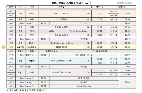 출처 : 짹 10월 일정표 짹에서 주워왔는데 새삼 이 스케줄들을 모두 소화하고있는 탄이들이 놀랍고 자랑스럽다 부디 아프지말고 건강하게 한국 오길 ❤