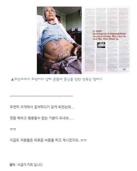 内鮮一体を立てながら支配していた朝鮮で日本は若い女性たちを拉致してボロジのようにつぶした. チョン氏の身に深く刻まれた入れ墨はどんな多くの話を聞くよりも日本がやらかした植民地支配の実態と天皇の軍隊の悪辣な本質を明確に見せてくれていた.