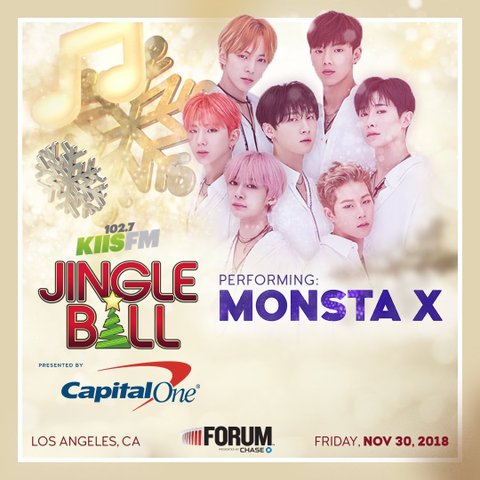 이번 징글볼은 미국 12지역에서 하는데 몬스타엑스는 5~6 곳 출연한대 ! 라인업으로는 카밀라 카베요, 두아리파, 션 멘데스, 카디 비, 비비렉사 , 파이브 세컨즈 오브 서머 , 캘빈 해리스 , 체인스모커 등등 들으면 알만한 팝 가수들인데 이 사람들하고 몬엑이랑 같이 무대 선다는 게 너무너무 설레고 기쁨 ㅠㅠ