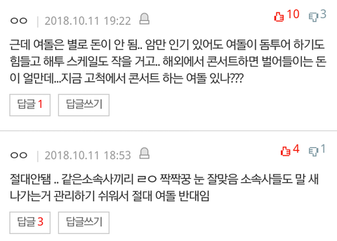 나 저 글 봤고 쓰니가 후배그룹으로 여돌 나왔으면 좋겠다고함 저 두 댓글이 이상한거지 거의 방탄처럼 칼군무추고 걸크러쉬쩌는 여돌 나왔으면하고 씀 나머지는 회사에서 현재 남자연습생만 뽑는다한거고ㅇ 이게 팩트니까 몰아가기ㄴ