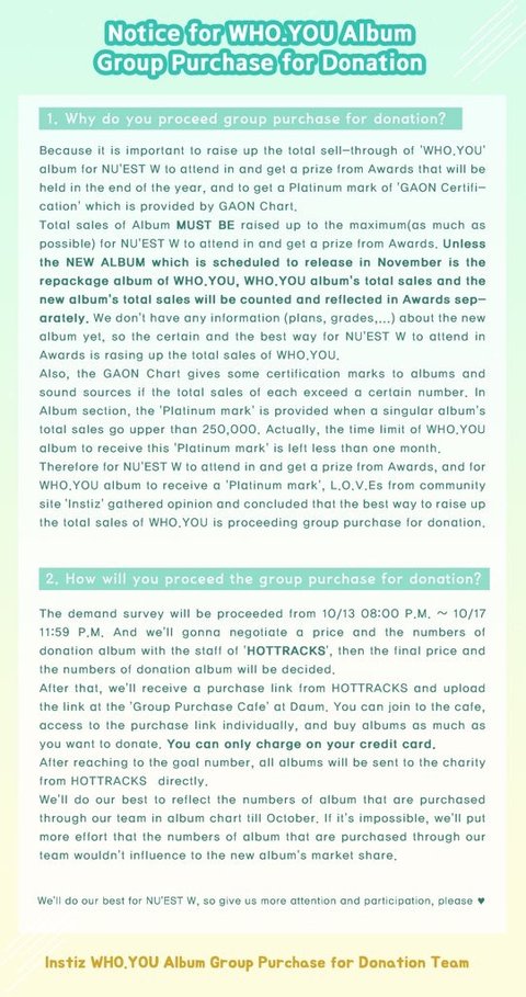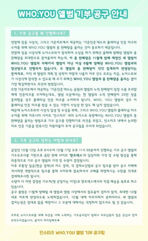 가온 25만장 플래티넘 달성을 위해 기부공구가 진행될 예정입니다! 새앨범이 리팩이 아닌이상 최대한 10월까지 후유(데자부) 앨범 25만장을 넘겨야 해용! 팬톡 러브님들의 많은 관심 부탁드릴게요