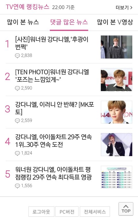 참고로 난 강다니엘이든 워너원이든 싫어하는 사람이 아니다 그렇다고 내가 워너원의 경쟁상대 아이돌의 팬도 아니고 그냥 저런식으로 연예기사란에 한 연예인으로만 도배되는게 언짢을뿐