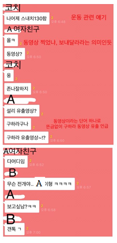 나, 오빠, 오빠 여자친구, 내 남자친구, 내가 아는 언니, 코치, 등 운동다닐 때 같이 술마시면서 놀러다녔던 사람들 전부 있는 10명되는 그 단톡에서 운동 관련해서 오빠 여자친구가 ‘동영상’이라는 단어 꺼내자마자 갑자기 뜬금없이 드립친답시고 ‘구하라 유출영상?’, ‘보고싶냐?’라고 말했지? 거기다 대고 다른 남자애는 ‘갠톡ㄱ’라고 말하고 말야..하하..