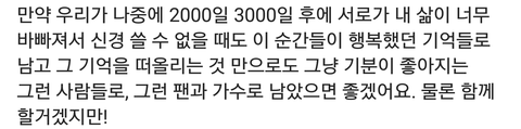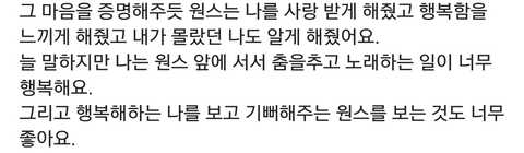 지효...진짜 팬사랑쩔고 팬들 마음 잘 알아주는 애야ㅠ 살면서 늘 좋은날만 있을순없단거 본인이 10년 연습생하면서 겪어왔으니 팬들한테도 지친 일상에 자기들이 조금이라도 비타민처럼 도움이 됐으면 좋겠다고 하는데 덕후들 살기 피곤하다가도 내가수가 이런거 알아주고 응원해주면 살맛나지ㅠㅠ 인간비타민 박지효 그리고 트와이스ㅠㅠ진짜 지효가 팬들한테 쓰는글보면 너무 공감가고 고마울때 많음 너무 많아서 손에 꼽기가 힘들정도로ㅜㅜ [오늘은 즐거운 하루였는지 힘든 하루였는지, 매일매일이 따분하고 똑같은 날들일지도 힘들고 지치는 날들일지도 모를 우리 원스에게 조금이나마 힘이 되고 싶어서 준비했어요. 2년 동안 우리에게 선물해 준 일들에 비하면 많이 부족하지만 다 보답하는 날까지 더 노력할게요-! 늘 감사합니다♥]