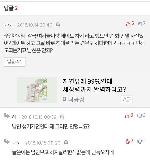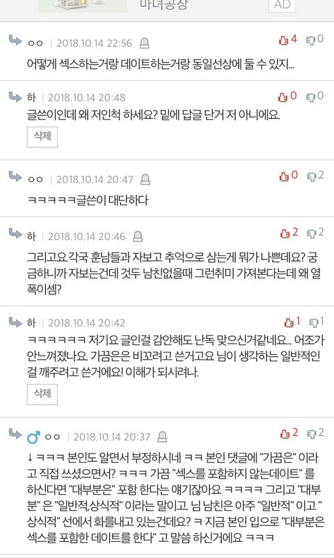 베댓에서 섹스를 데이트로 혼동하는 불쌍한 분에게 데이트가 섹스를 의미하지 않음을 설명한 댓글 이외의 제 닉네임으로 쓴 대댓글들은 제가 아닙니다.