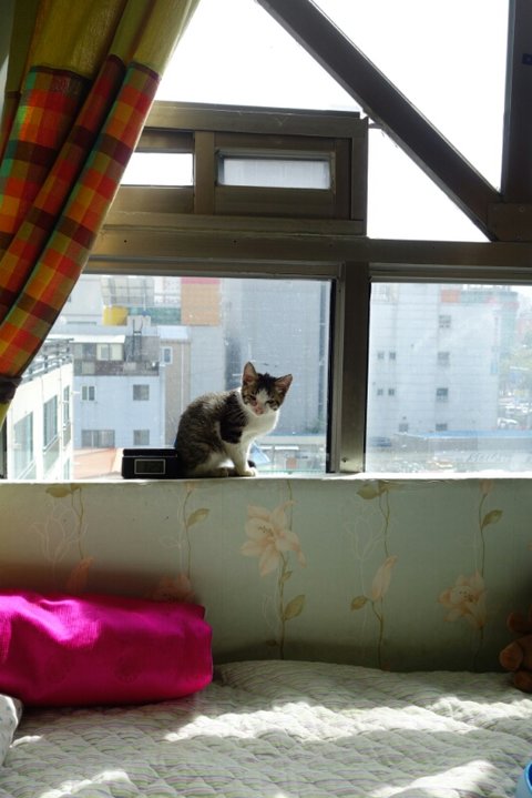 새끼 고양이의 이름은 쪼매니로 지었고 치료를 위해 집으로 데려와서 심바와 같이 지내고 있어요. 심바를 너무도 좋아하고 곁에서 잠도 자고 잘놀면서 지내고 있어요. 그새 좀 자랐고요. 아직 좀 기침과 콧물을 달고 있는데 어서 좋아지면 좋겠어요.