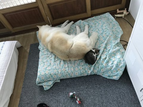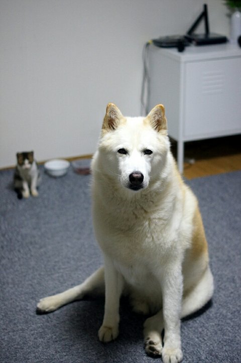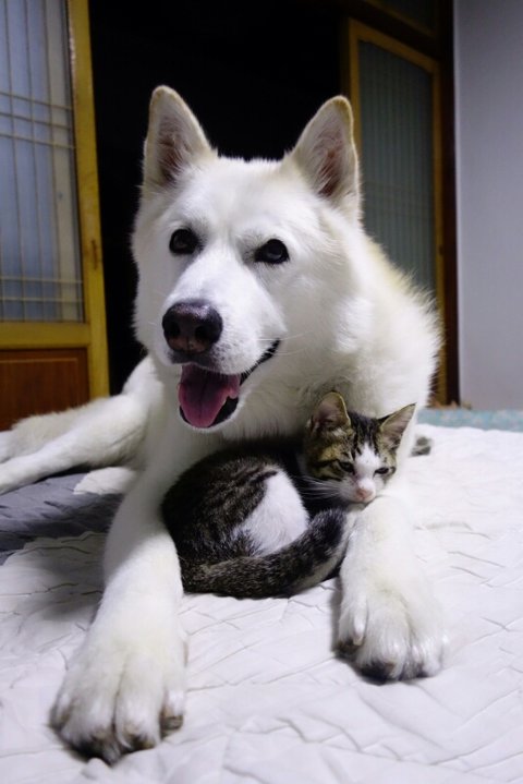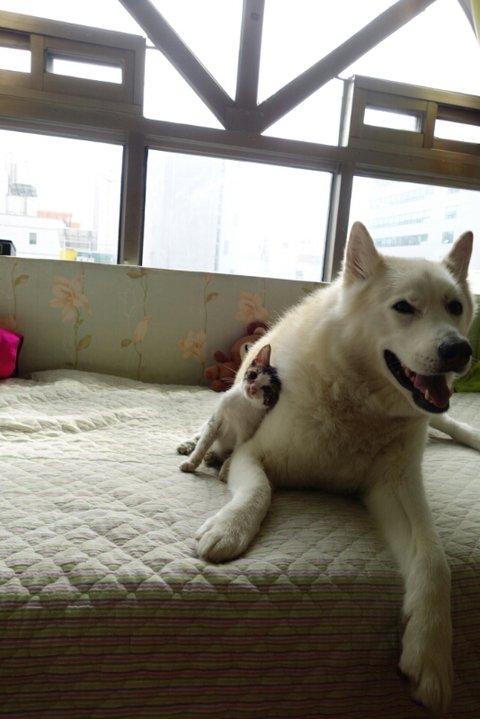 예전에 글 올린적도 있지만 심바는 고양이를 좋아해요. 하지만 이렇게 어린 길고양이가 심바에게 스스로 다가와 몸을 맡기는 상황은 저 역시 처음이라 신기했어요. 몸이 아파서 누군가에게 의지하고 싶었던 듯 해요.