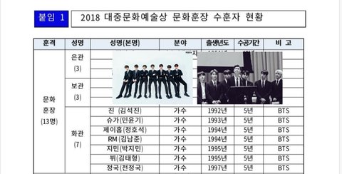 탄이들 이번에 받는 대중문화.예.술상 수상자 리스트인데