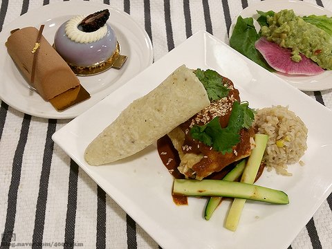 돌절구로 만든 살사 소스를 곁들인 가지 요리. 가지 속에는 쌀과 버섯을 채워서 요리했습니다.